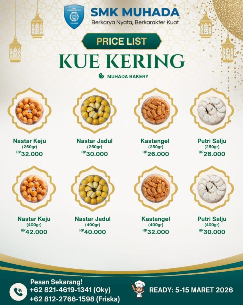 Kami mengundang seluruh orang tua, masyarakat, dan berbagai pihak untuk mendukung kegiatan ini dengan melakukan pemesanan selama periode 5–15 Maret 2026. Semoga kegiatan MUHADA BAKERY dapat menjadi langkah awal bagi lahirnya generasi muda yang kreatif, mandiri, dan berjiwa wirausaha.